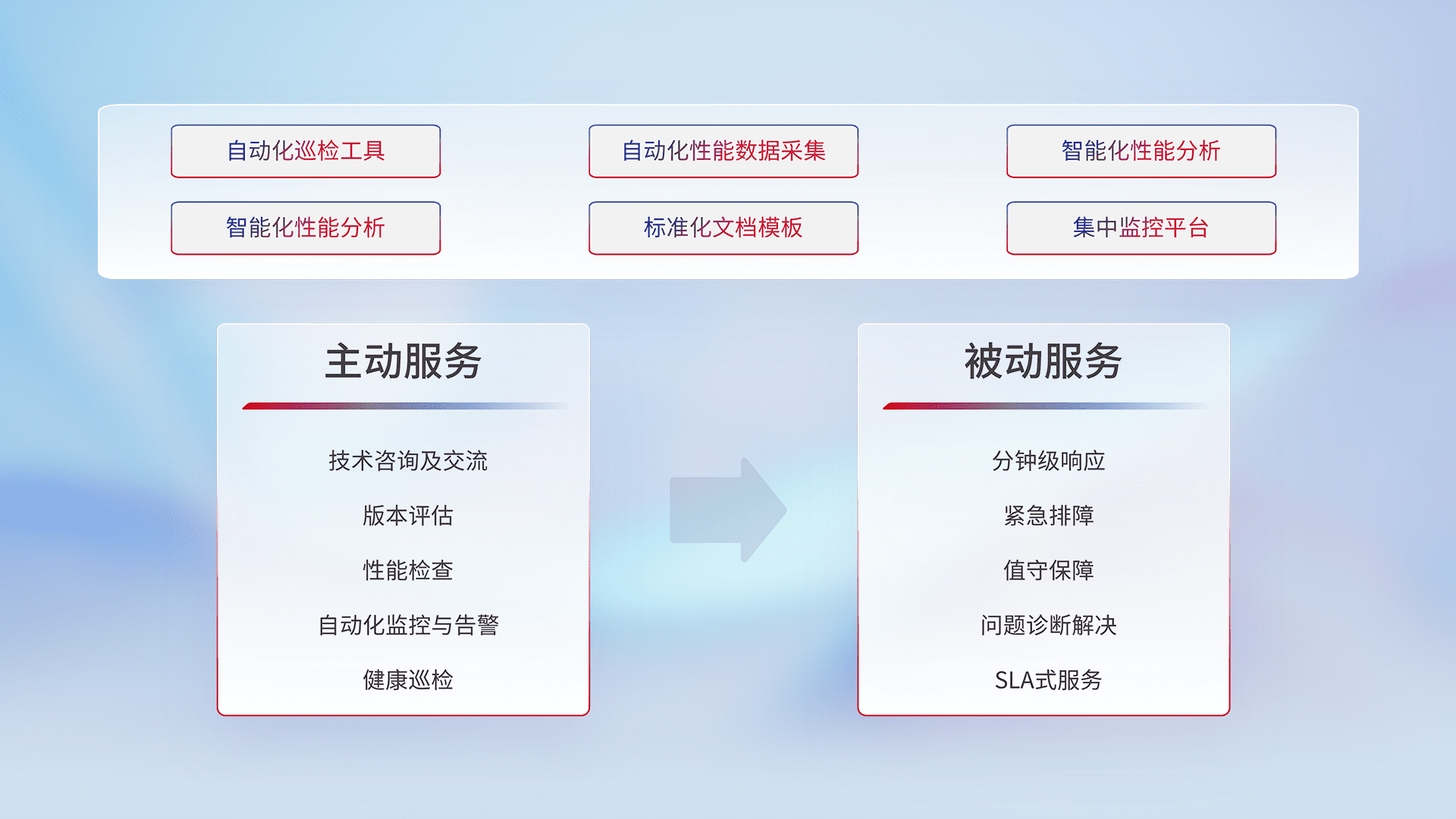 智能化工具和标准化文档,,,保障服务质量,,,提供主动服务(包含技术咨询、、、版本评估、、性能检查、、、、自动化监控与告警、、健康巡检)和被动服务包含(分钟级响应、、紧急排障、、、、值守保障、、问题诊断解决、、、SLA服务)。。